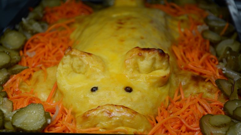 Такое блюдо однозначно станет изюминкой новогоднего стола 2019 года, ведь символ наступающего Нового года — свинья! Для его приготовления не нужно быть скульптором, всё делается очень просто. Готовьте, у Вас всё получится с первого раза. Так же можно приготовить и постного поросёнка, просто вместо фарша добавить грибы, а в картофельное пюре вместо яйца добавить немного больше муки.