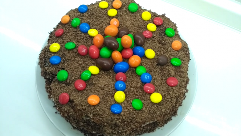 5.Пропитавшийся тортик переворачиваем на блюдо, сняв пищевую пленку и украшаем тертым шоколадом и цветными конфетами.