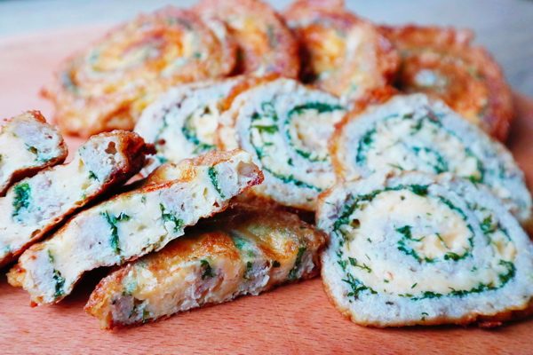 8) В горячем виде такие рулетики очень сочные с расплавленным сыром и зеленью – очень вкусно, в холодном виде тоже очень вкусно, они отлично держат форму. На праздничный стол можно подать в трех вариантах: разрезать вдоль, получается довольно тонко и красиво смотрится в разрезе, разрезать поперек, так разрез тоже очень красиво смотрится, разрезать можно только хорошо остывшие кусочки. Если подавать горячими, разрезать не нужно.