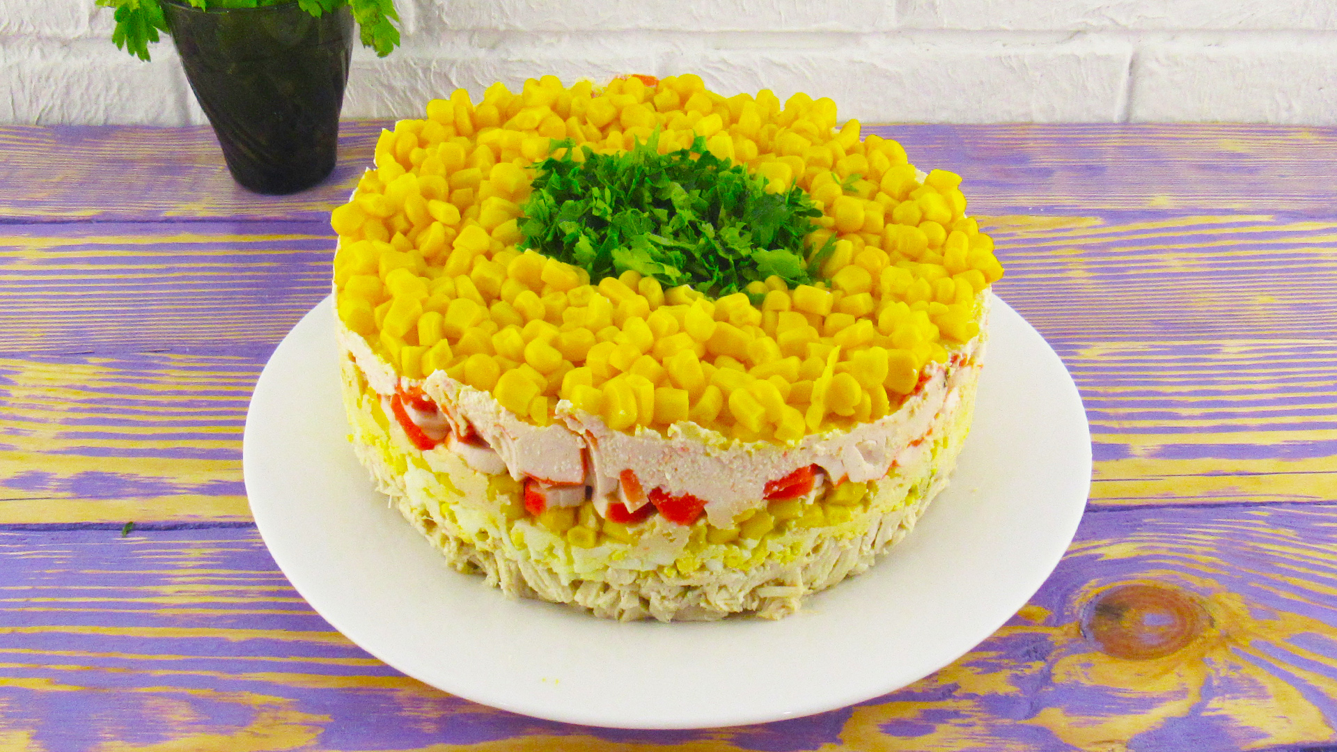 6. Приступаем к украшению салата. По кругу выкладываем кукурузу, а в середину мелкорубленную петрушку, и отправляем салатик в холодильник на 2 часа для пропитки.
