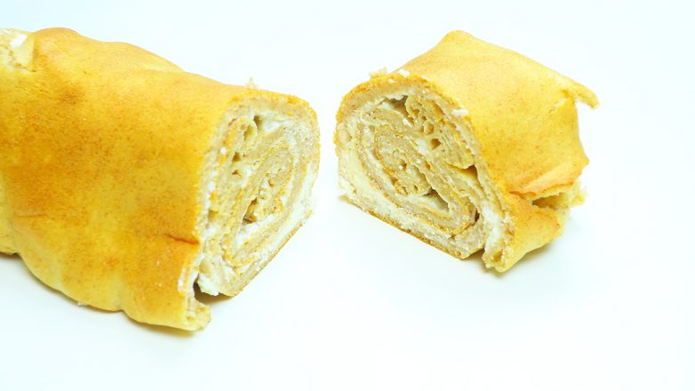 4. На остывший испеченный блинчик равномерно выкладываем творожную начинку и сворачиваем рулетом. Нарезаем порционными кусочками, можно посыпать сахарной пудрой или полить мёдом! Приятного аппетита!