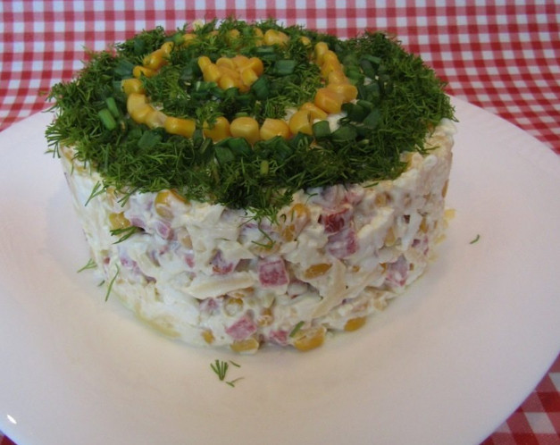 Салат с копченой колбасой и кукурузой – быстрый в приготовлении и вкусный. Ингредиенты, входящие в его состав, прекрасно сочетаются, он отлично смотрится на праздничном столе.