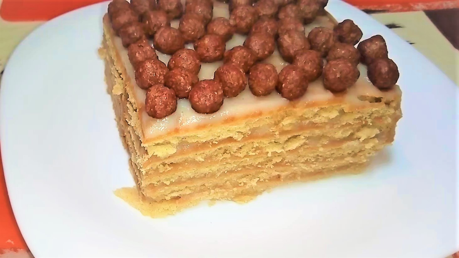 Форму застилаем пергаментной бумагой, печенье обмакиваем в молоке и выкладываем в форму, смазываем густо кремом, затем снова печенье, крем и так несколько слоев. Смазываем бока тортика, верх и украшаем на свое усмотрение, это могут быть орехи, изюм, тертый шоколад, у меня шоколадные кукурузные шарики.