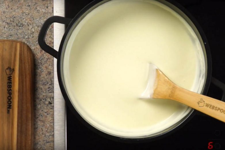 Тем временем в сотейник выливаем сливки, молоко, ванильный сахар, крем сыр и на средне-мелком огне доводим это все почти до кипения, постоянно помешивая, когда появляются первые бульки и все хорошо парует, после чего добавляем агар-агар и варим 4 минуты, лучше всего размешивать все с помощью венчика н равномерно распределит его.Шаг 4
