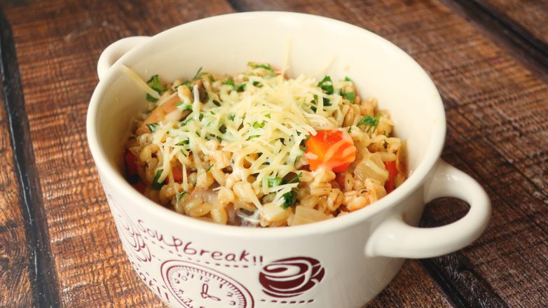 5. Когда перловая каша будет готова, раскладываем по тарелкам, посыпаем зеленью и потертым сыром.