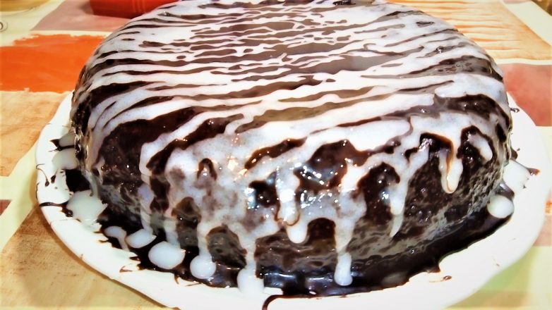Когда пирог остынет смазываем полностью шоколадным кремом, а сверху наносим лимонную глазурь тонкой струей используя кондитерский шприц.