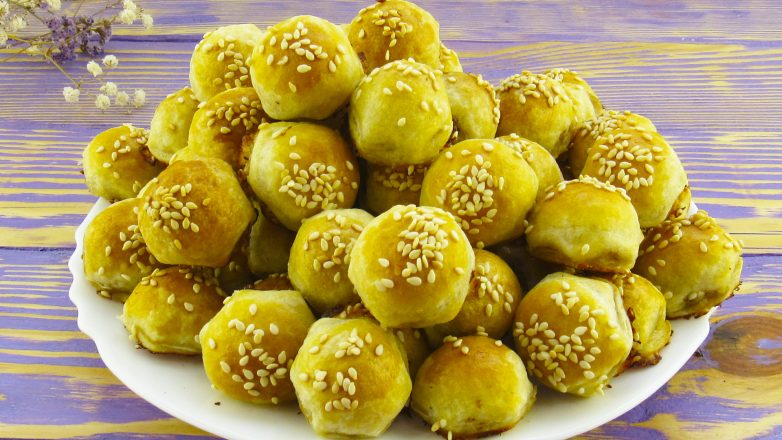 5. Раскладываем их на противень устеленный пергаментной бумагой, смазываем взбитым яйцом и присыпаем кунжутом, и отправляем в разогретую до 200 градусов духовку на 15-20 минут.