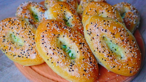 5) Смазать пирожки яичным желтком с 1 ст.л. воды. Посыпать кунжутом. Сделать надрез посередине пирожка. Расправить серединку и смазать остатками желтка с водой.