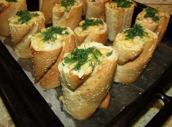 Горячая закуска в багете – быстрое в приготовлении и вкусное блюдо. По своему желанию вы можете менять ингредиенты начинки. Эта закуска вполне может заменить основное блюдо.