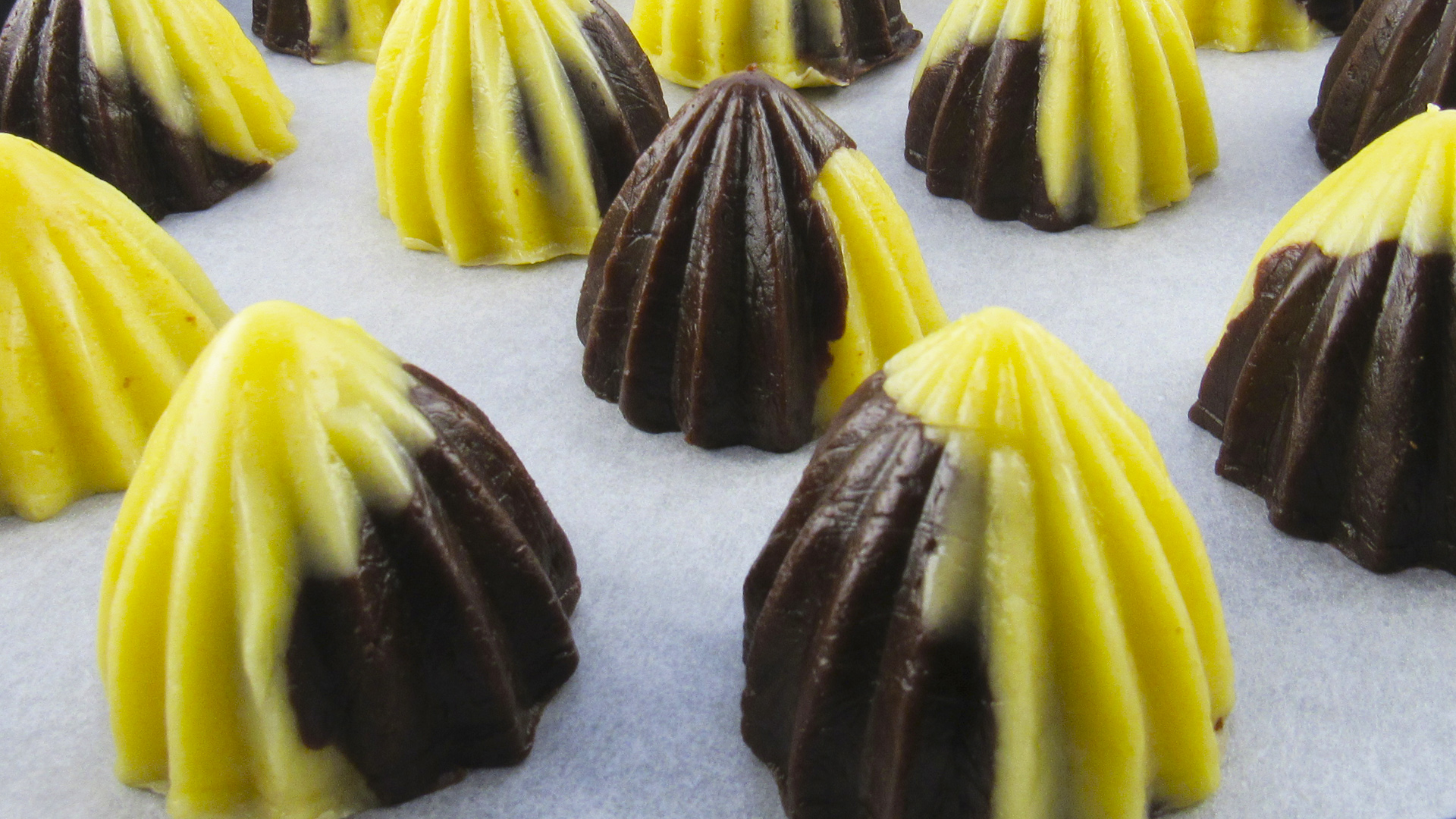 5.Берём кусочек белого теста, формируем шарик, кладём в форму, и распределяем с одной стороны формы, также поступаем и с коричневым тестом.