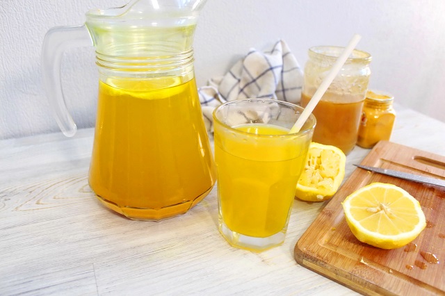 Получившуюся смесь переливаем в графин и остужаем до теплого состояния. Выдавливаем в графин сок лимона. При этом смесь меняет цвет с насыщенного оранжевого до желтого. Добавляем мед. Хорошо перемешиваем.