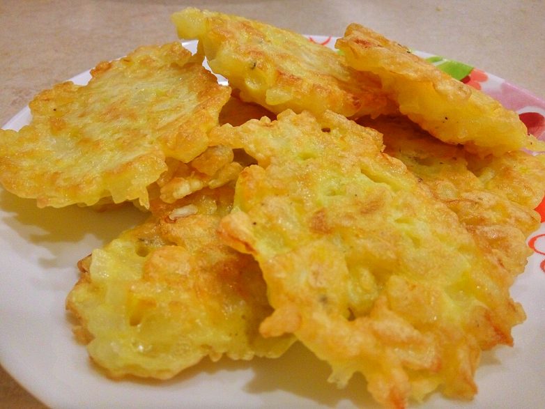 4.Выкладывайте по 1 столовой ложке лукового теста на сковороду и жарьте с двух сторон до золотистого цвета.