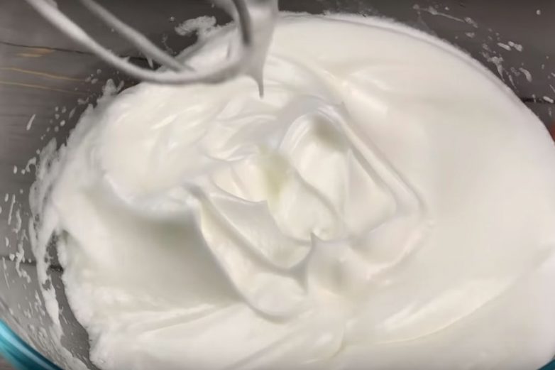 Взбиваем белки с щепоткой соли до состояния пены, а также постепенно добавляем 25 грамм сахара, взбиваем до очень густой массы, похоже на бизе или меренги.Шаг 5