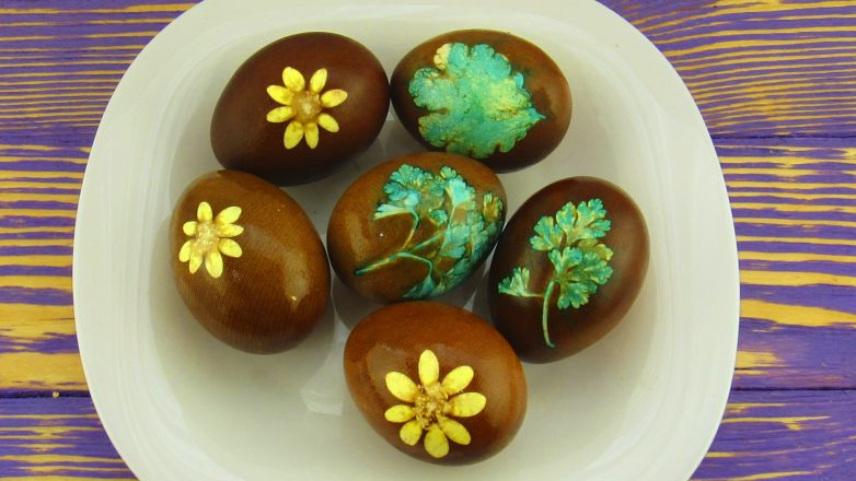 Я буду использовать для покраски яиц луковую шелуху одним цветом, разные листики и цветочки.