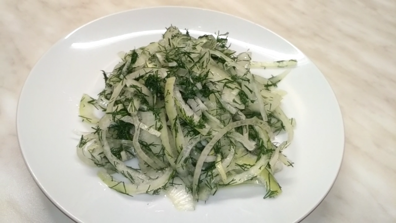 4.Отправляем лук и нарезанную зелень в маринад.Хорошо перемешиваем, накрываем миску пищевой пленкой и ставим в холодильник минут на 20-30.