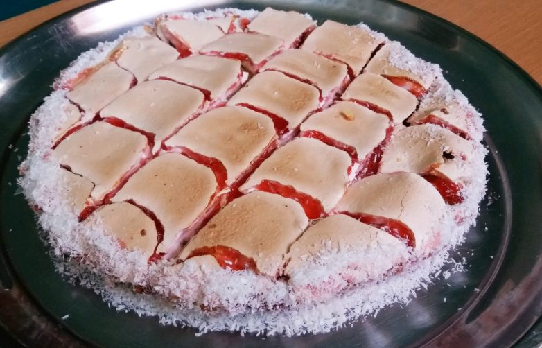 Затем края пирога смазываем вареньем и обсыпаем стружкой из кокоса.