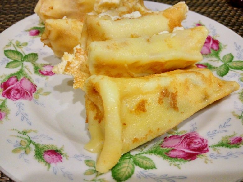8. Блины разрежьте пополам. На центр широкого края выложите творог, накройте его боковыми краями и заверните блин. Тоже самое повторите со всеми блинчиками.