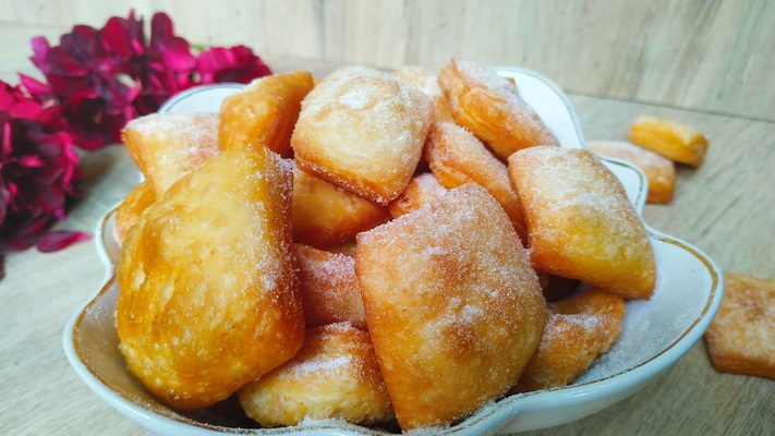3) Обжарить на разогретом растительном масле с двух сторон до румяной, загорелой корочки. Снять на бумажные полотенца. Немного остывшие подушечки посыпать мелким сахаром, можно посыпать сахарной пудрой, добавить немного корицы или ничем не посыпать, а подать с вареньем.