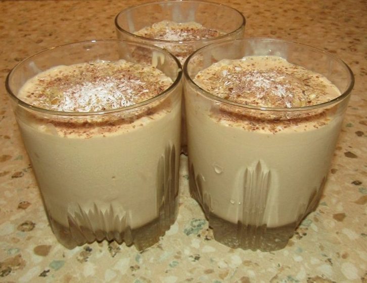 С помощью миксера сливки взбиваем до густоты. Добавляем вареное сгущенное молоко и еще раз все хорошо взбиваем. Отправляем в морозильную камеру на 2-3 часа, каждые 30 минут достаем и хорошо перемешиваем. Выкладываем в стаканы или креманки и украшаем измельченными грецкими орехами, кокосовой стружкой и потертым шоколадом.