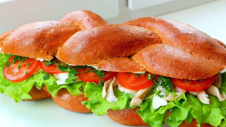 4. Есть халу можно как со сладкими так и с солеными дополнениями. Например халу сендвич) с творожным сыром, яйцом, кальмаром, помидорами и листьями салата.