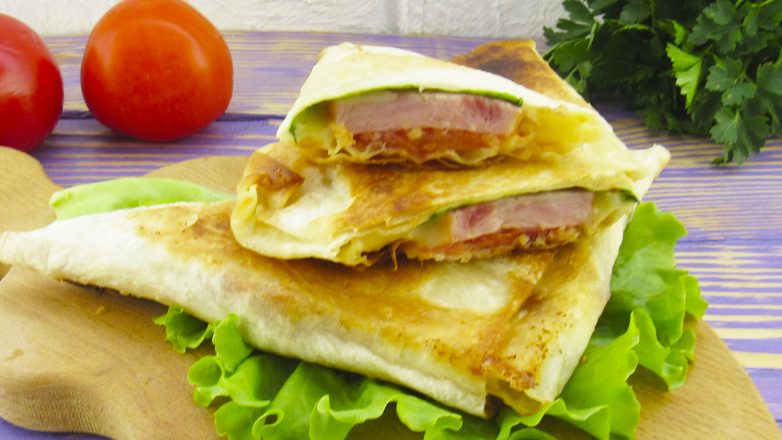 5. На лаваш кладем лист салата, затем колбасу, помидоры, и выкладываем сыр, заворачиваем лаваш в виде треугольника.