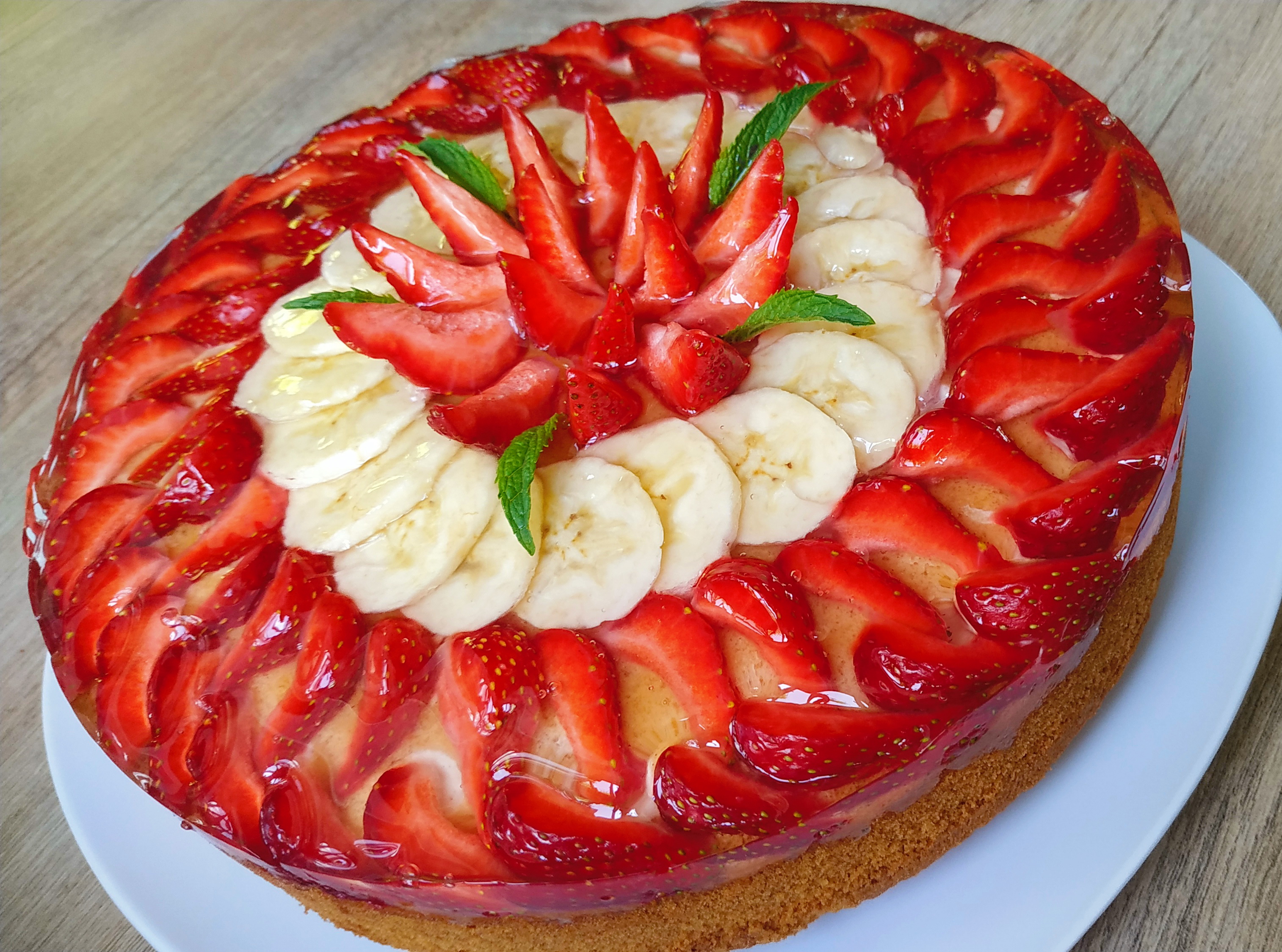 Таким же образом я испекла второй пирог, украсила его бананами и клубникой.