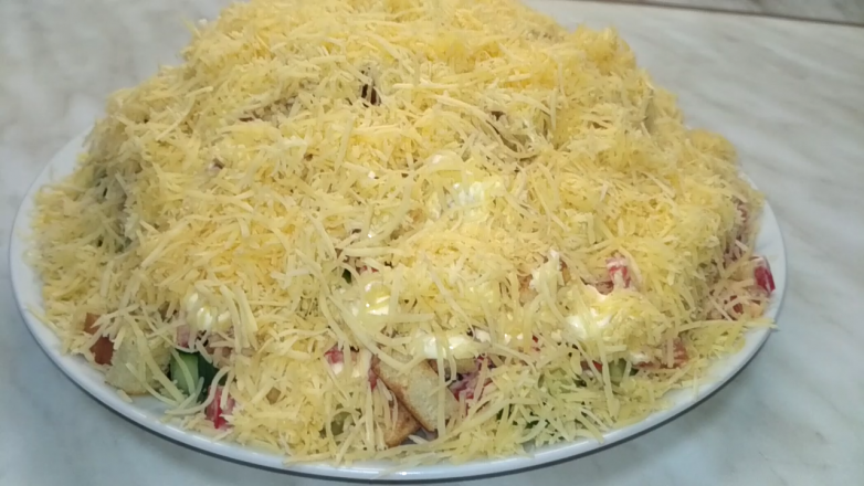 6.Сыр трем на мелкой терке и обильно посыпаем салат.