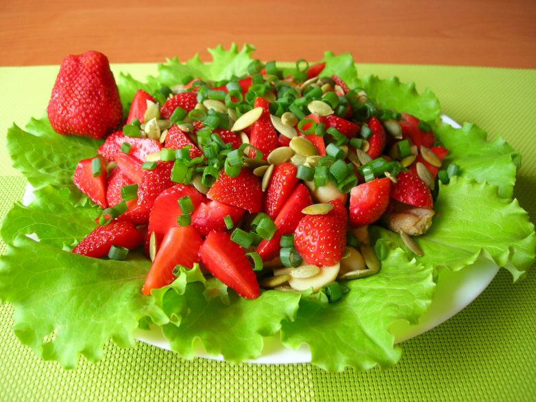 3. Собираем салат: тарелку выстилаем салатными листьями, выкладываем остывшие кусочки куриного филе, грибы, клубнику и сверху посыпаем тыквенными семечками и колечками зеленого лука.