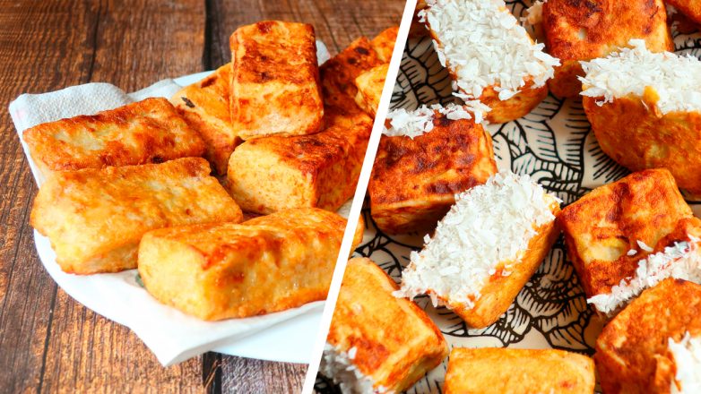 8. Я разрезала каждый кусочек еще на две части и обмакнула в кокосовую стружку, также можно посыпать корицей или сахарной пудрой.