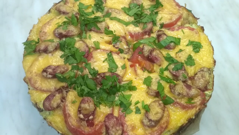 5.Выкладываем тесто в форму для выпечки смазанную растительным маслом (у меня разъемная форма 25 см в диаметре).Равняем тесто ложкой и верху выкладываем нарезанные помидоры. Отправляем в духовку разогретую до 200 градусов на 15-20 мин.Спустя указанное время вынимаем форму из духовки и выкладываем колбасу, а также обильно засыпаем сыром и отправляем в духовку еще на 10 минут.