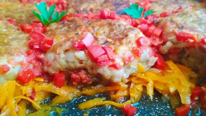 5) Лук с морковью обжариваю на растительном масле до мягкости. Сверху кладу котлеты, заливаю томатным пюре, добавляю кубики сладкого перца и тушу на медленном огне минут 10-15 под закрытой крышкой. Котлетки можно кушать сразу после обжарки, не тушить в сковороде, в таком случае, лук необходимо измельчить блендером, иначе он будет хрустеть.