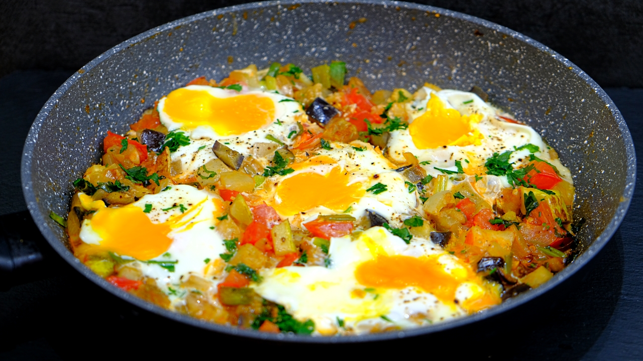 Простой рецепт из яиц и овощей на завтрак. Я использую множество доступных летом овощей: баклажаны, кабачки, лук репчатый и зеленый, помидор, болгарский перец. В результате получается очень сочное и полезное блюдо на завтрак, а главное – быстро и просто!
