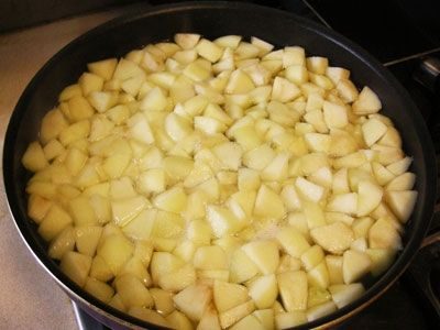 Теперь включаем плиту на средний уровень и ставим сковороду. Укладываем в нее нарезанные фрукты, добавляем в сковороду соль, сахар, яблочный уксус и 100 миллилитров чистой дистиллированной воды. После закипания жидкости, уменьшаем температуру плиты до уровня между маленьким и средним. Вооружаемся деревянной кухонной лопаткой, и периодически помешивая яблоки, томим их под закрытой крышкой до смягчения. На этот процесс уйдет примерно 25 – 30 минут в зависимости от кухонного инвентаря и сорта яблок. После того как яблоки дойдут до нужной консистенции и из сковороды выпариться вся влага, снимаем емкость с плиты и ставим на разделочную доску.