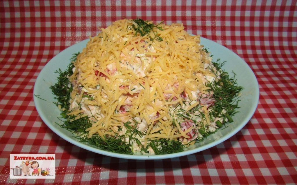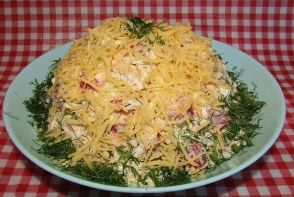 Пекинскую капусту порезать как на салат. Помидоры порезать мелкими кубиками. Укроп порубить ножом, чеснок пропустить через пресс или потереть на мелкой терке. Сыр потереть на крупной терке. Все ингредиенты поместить в салатник, немного укропа и сыра оставить для украшения, посолить, заправить майонезом и перемешать. Выкладываем салат в салатник и украшаем сверху зеленью укропа и потертым сыром, сразу подаем к столу. Несмотря на то, что этот салат готовится 10 минут, он получается очень вкусным и займет достойное место на праздничном столе.