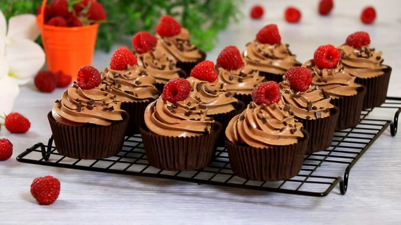 Сверху посыпаем капкейки шоколадными осколками и украшаем свежей малиной.