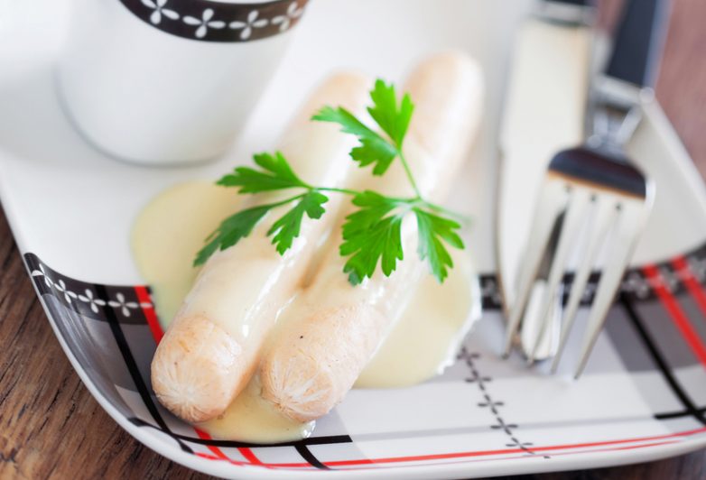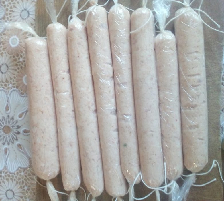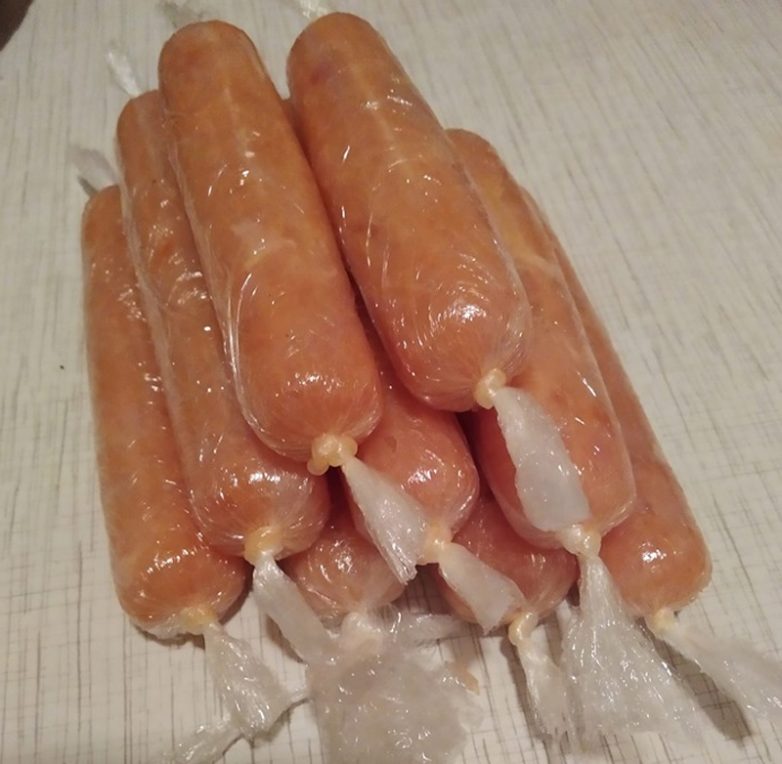 Чтобы сосиски держали форму, куриным фаршем нужно начинить специальную пищевую (коллагеновую) оболочку. Ее без проблем можно купить супермаркетах или в интернете. Способ попроще — завернуть фарш в обычную пищевую пленку. Это не так сложно, как кажется.