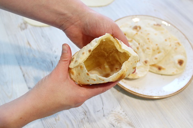 Это бездрожжевые лепешки на воде, которые выпекаются на сковороде, а внутри них получается карман для начинки. В кармашек можно положить мясо, овощи, соусы. Также такие лепешки можно есть как хлеб.