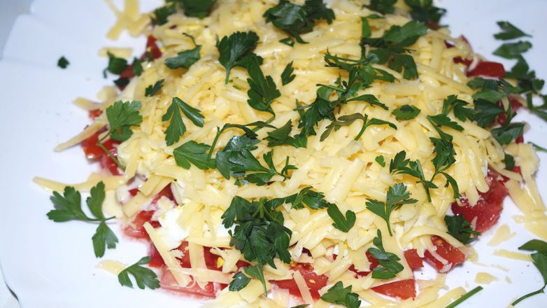 Слоеный салат из помидор, сыра и яиц