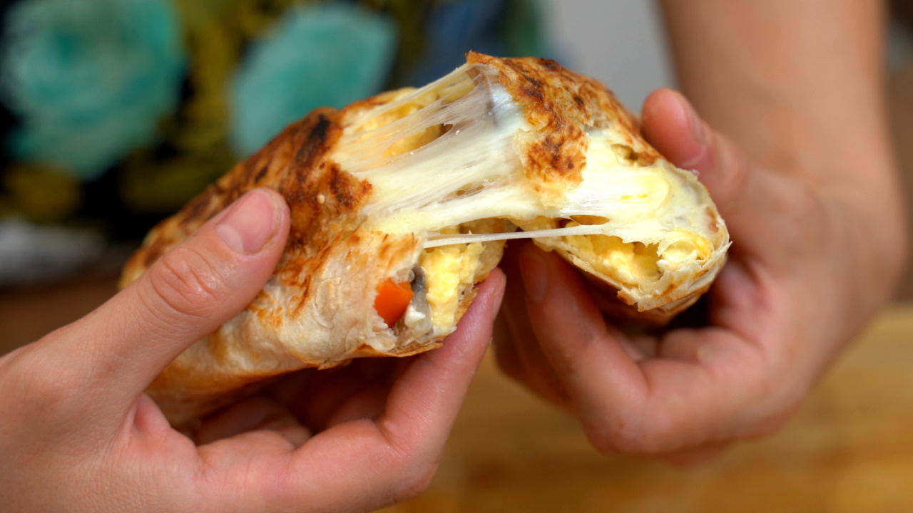 3. Помидоры нарезать кубиками, сыр натереть на терке. Лепешку смазать сметаной, выложить яичные хлопья, грибы, помидор и сыр, свернуть рулетиком.