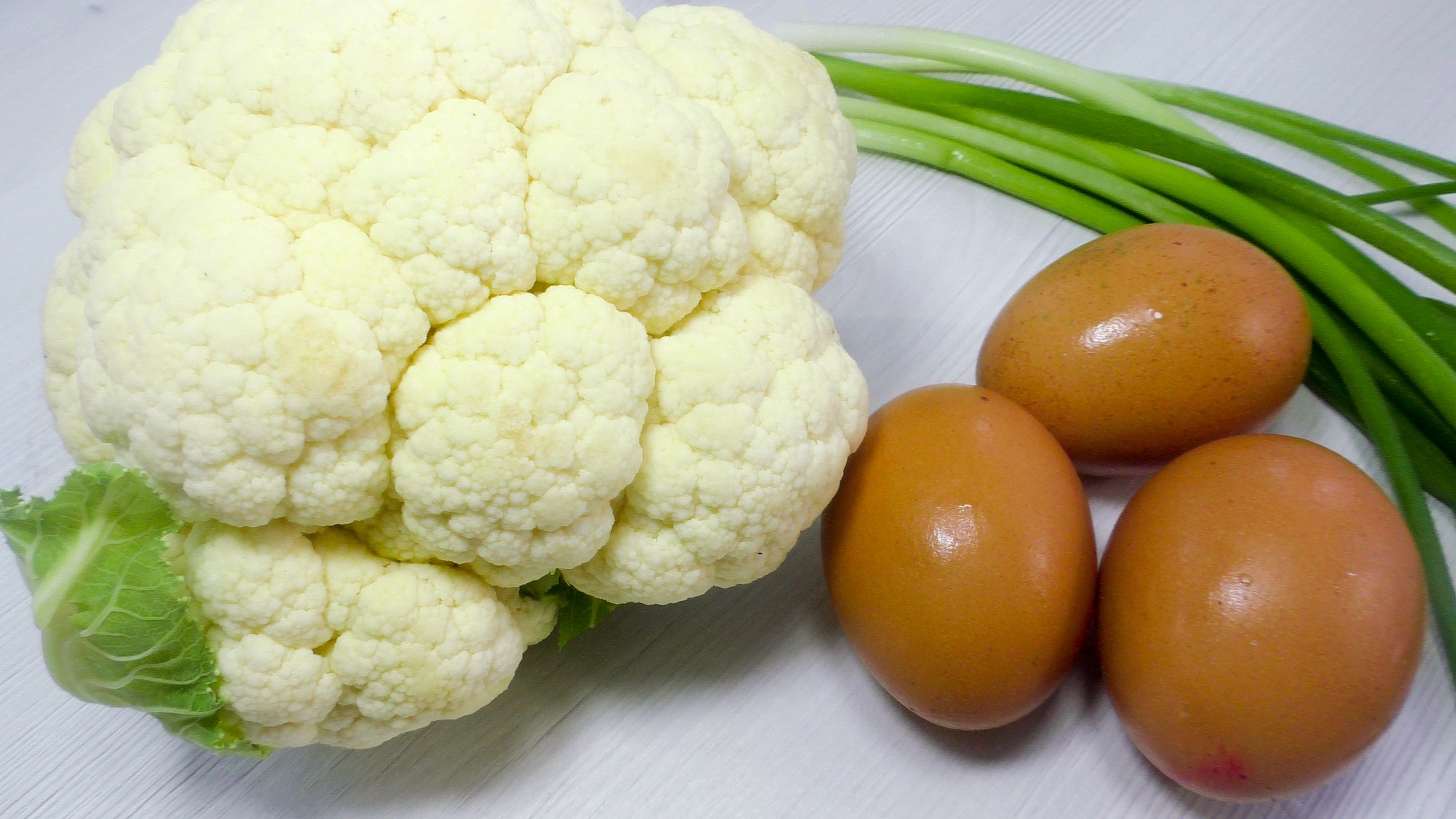 Цветная капуста с яйцом и зеленым луком, со сливочным вкусом готова. Подавать к столу горячей.