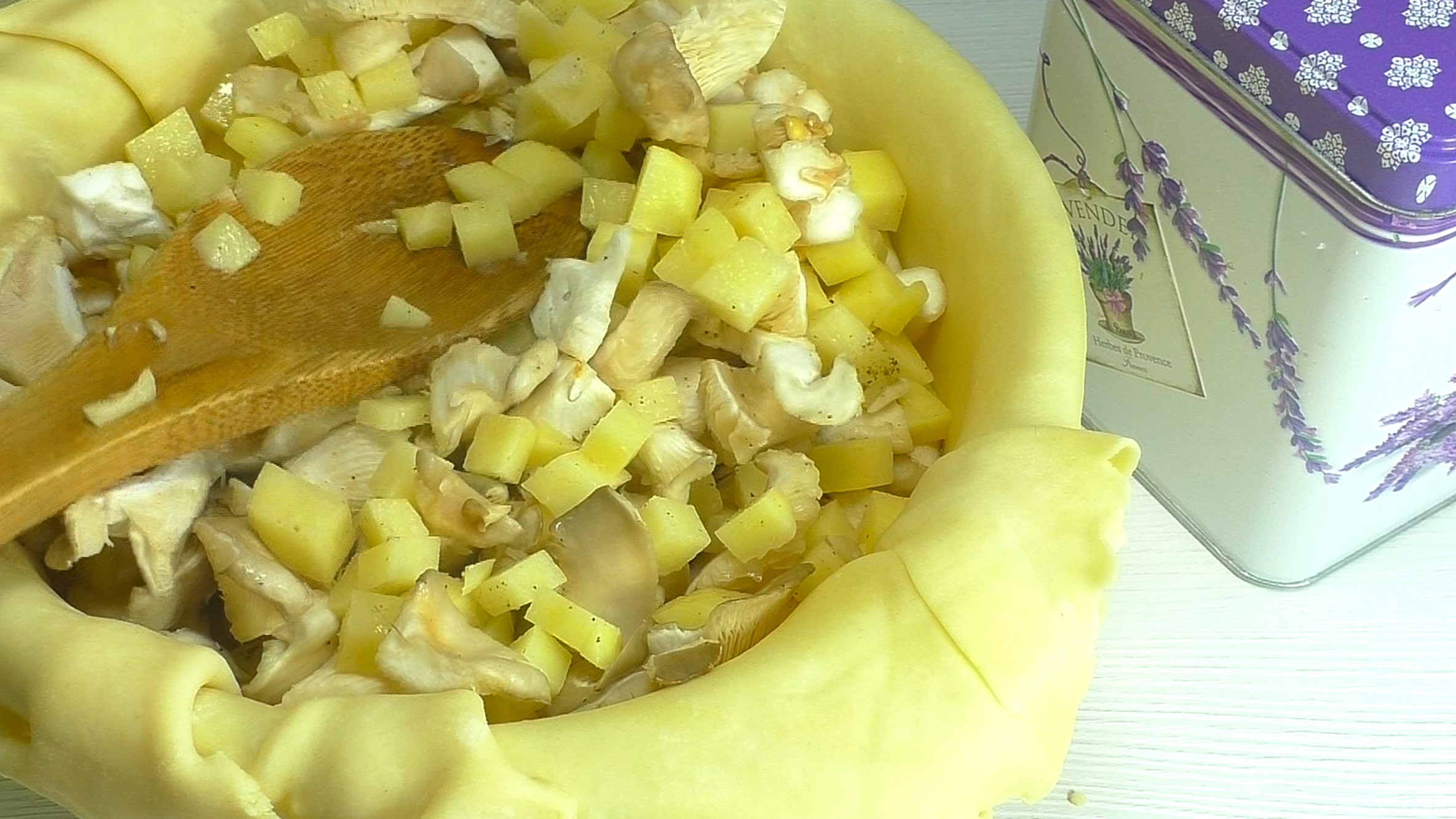 Закрываем сверху краями теста так, что бы по центру осталось небольшое отверстие.