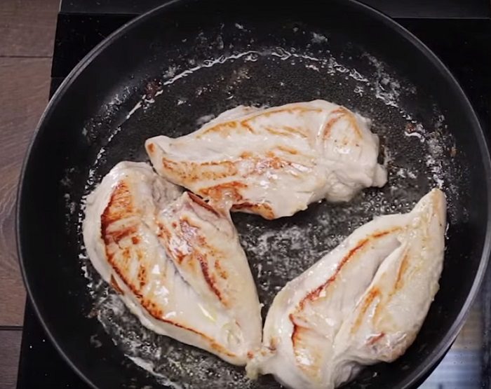 В нагретую сковороду влей немного растительного масла и добавь кусочек сливочного, перемешай. Положи в сковороду 3 вымытые куриные грудки, посоли и поперчи с двух сторон, обжаривай их до слегка золотистой корочки. Переложи в форму для выпекания.