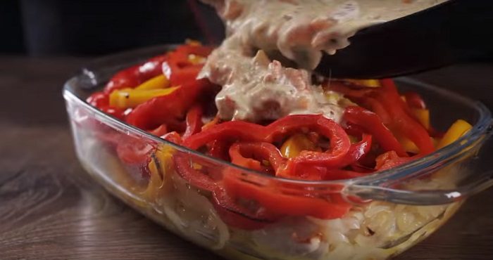 Накрой противень фольгой и хорошенько запечатай со всех сторон. Выпекай в заранее разогретой до 180 градусов духовке в течение получаса. Затем достань блюдо, сними фольгу и посыпь его сыром. Поставь запекаться еще на 10 минут.