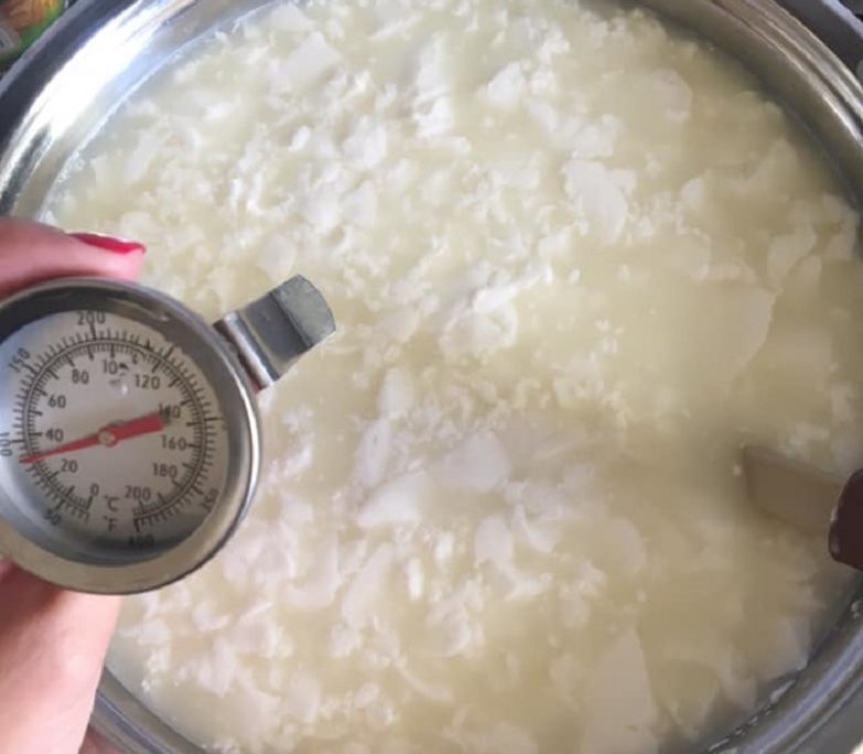Через 10 минут нарежь сгусток вдоль и поперек и снова оставь на огне на 10 минут.Еще через 10 минут нарежь сгусток по диагонали, включи нагрев на минимум и начинай мешать зерно. Доведи температуру до 42 градусов, на это уйдет примерно 15 минут. Всё время помешивай, чтобы зерна не слипались.По достижении нужной температуры выключи нагрев и дай зерну немного осесть.Далее установи в кастрюлю дуршлаг, в него постели марлю. Набирай чашкой сыворотку с зерном и выливай в дуршлаг. В результате в дуршлаге останется слой сыра. Дай жидкости стечь и приступай к вытягиванию.