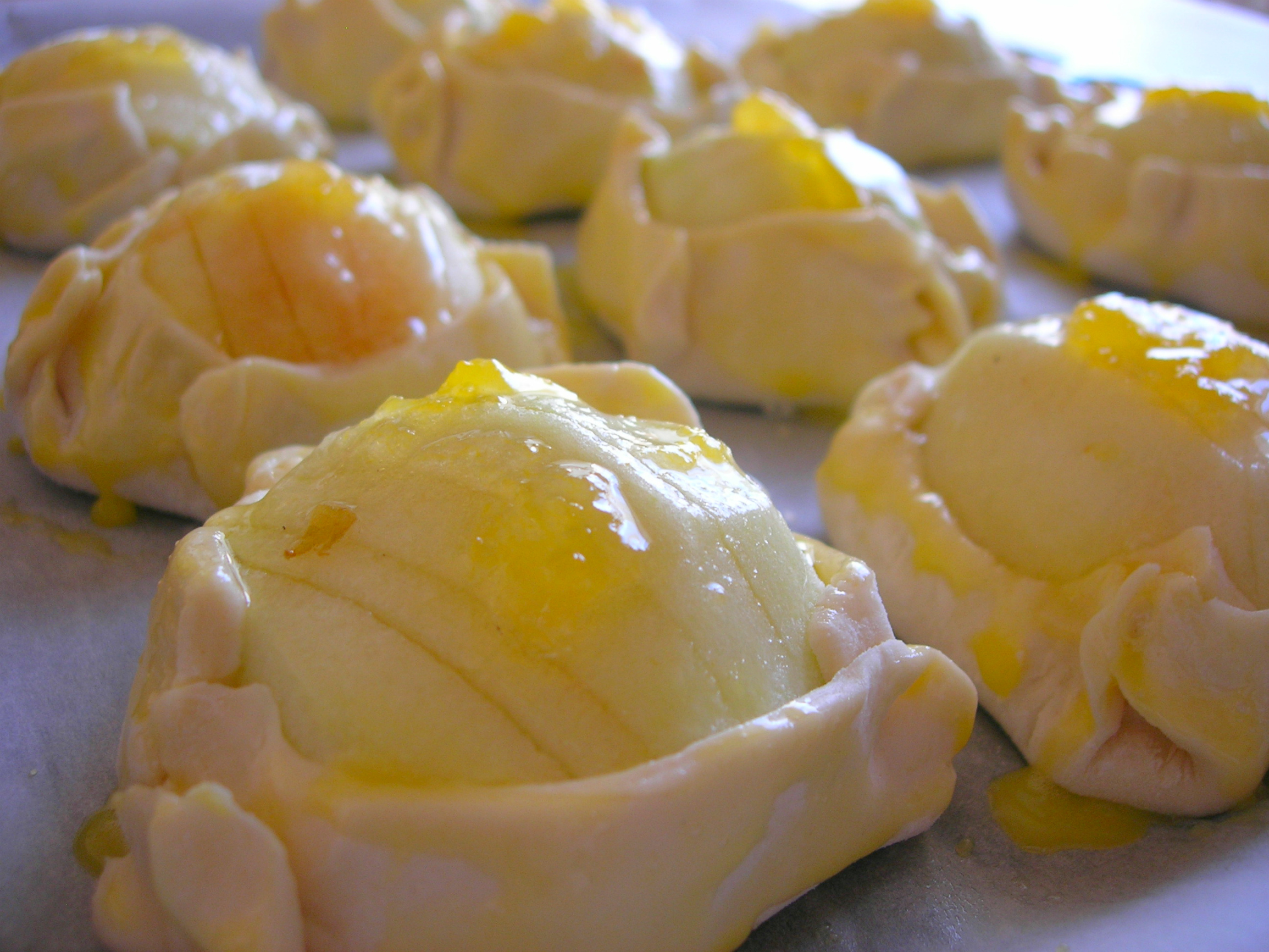 4. Тесто смазываем желтком, а яблоки подогретым абрикосовым повидлом или джемом.