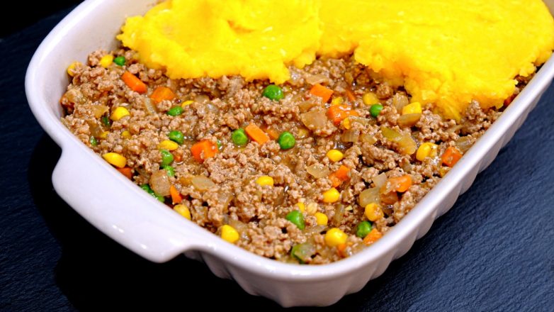 3. В форму выложить фарш, сверху картофельно-тыквенное пюре. При помощи вилки можно сделать рисунок на верхнем слое.