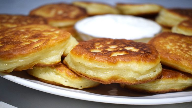 4. Готовые оладьи подаю со сметаной. Приятного аппетита!