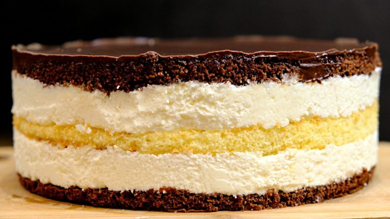 5. Если Вы делаете торт из 4 коржей, то разрежьте шоколадный и светлый корж пополам, а крем разделите на 3 части. Если из 3 коржей, то разрежьте большой шоколадный корж пополам, а крем разделите на 2 части. Далее собираем торт. Если из 4 коржей, то первым идет светлый корж, крем, шоколадный корж, крем, светлый корж, крем, шоколадный крем и глазурь. Если торт будет из 3 коржей: шоколадный корм, крем, светлый корж, крем, шоколадный корж и глазурь. Готовому торту дайте 2-3 часа постоять в холодильнике. Перед подачей достаньте заранее из холодильника, чтобы сливочное масло в креме немного подтаяло, тогда крем станет нежнейшим суфле.