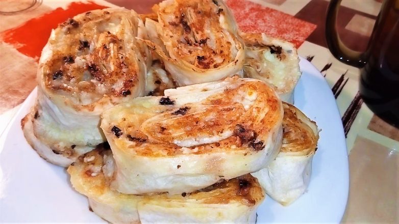 Половину порции творога выкладываю по всей поверхности лаваша, сверху накрываю другим листом лаваша и хорошо промазываю его вареньем, сверху снова выкладываю вторую половину творога и заварачиваю в тугой рулет. Края рулета брезаю, они мне уже не понадобятся, рулет нарезаю на кучочки в три сантиметра и обжариваю с двух сторон на сливочном масле.