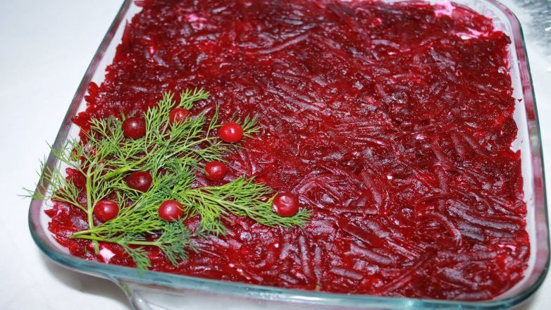Рыба, картофель, морковь, огурцы, свекла. Дайте салату постоять 2 часа и подавайте к столу.